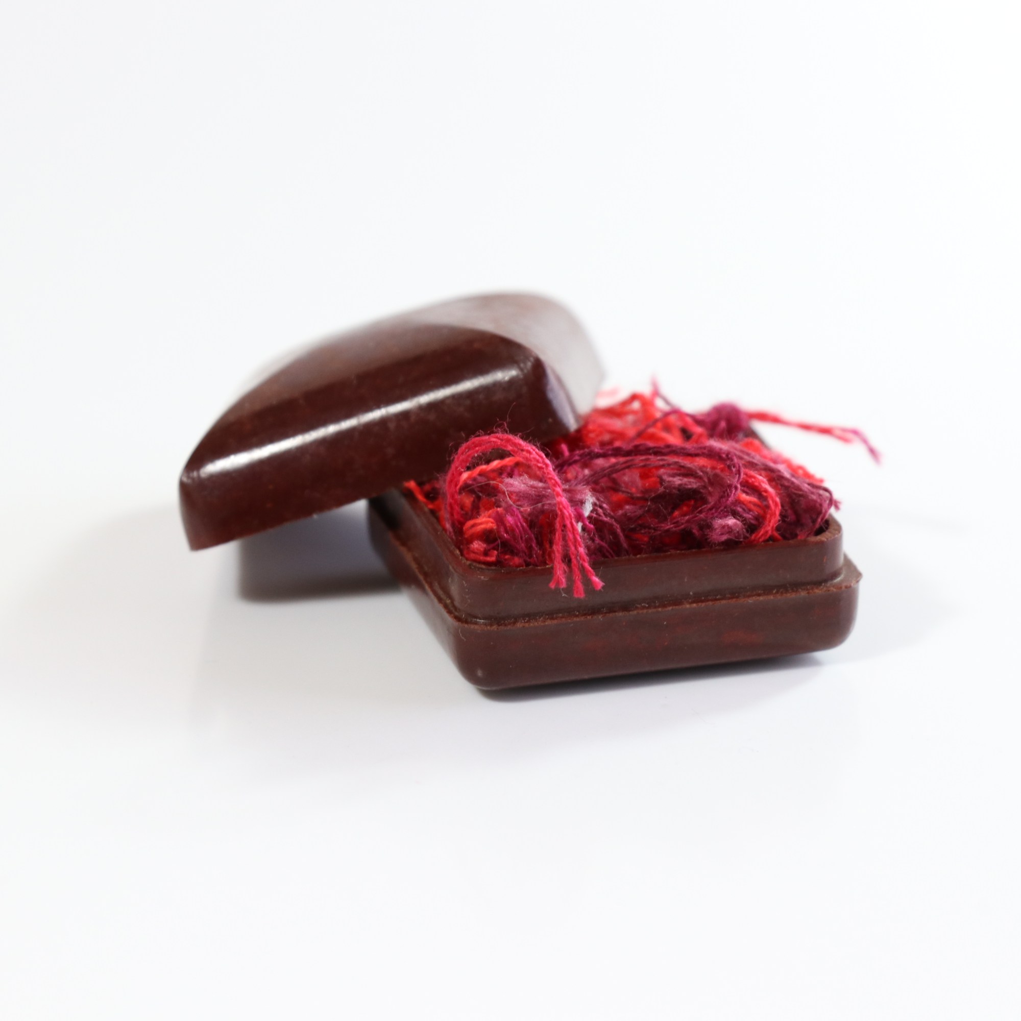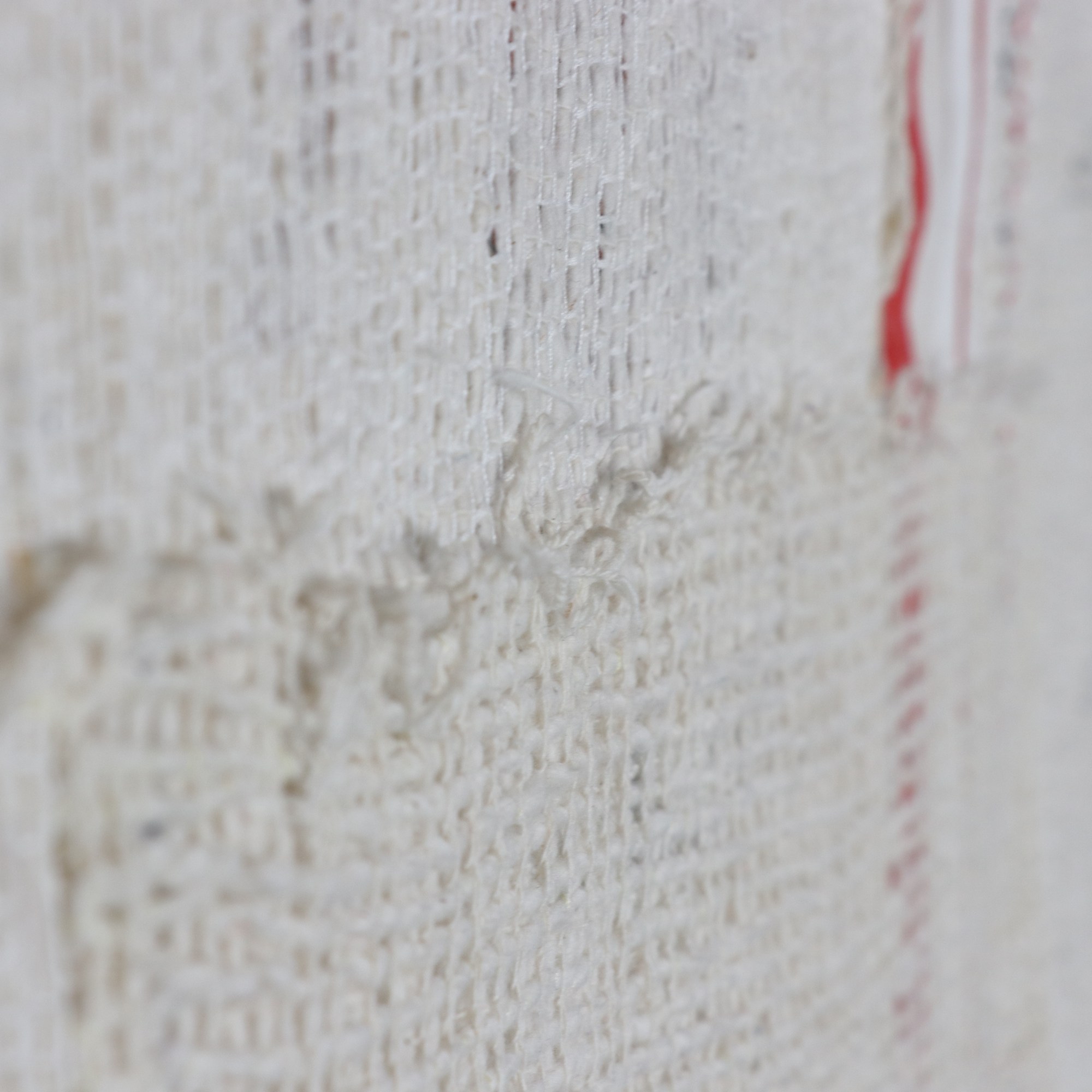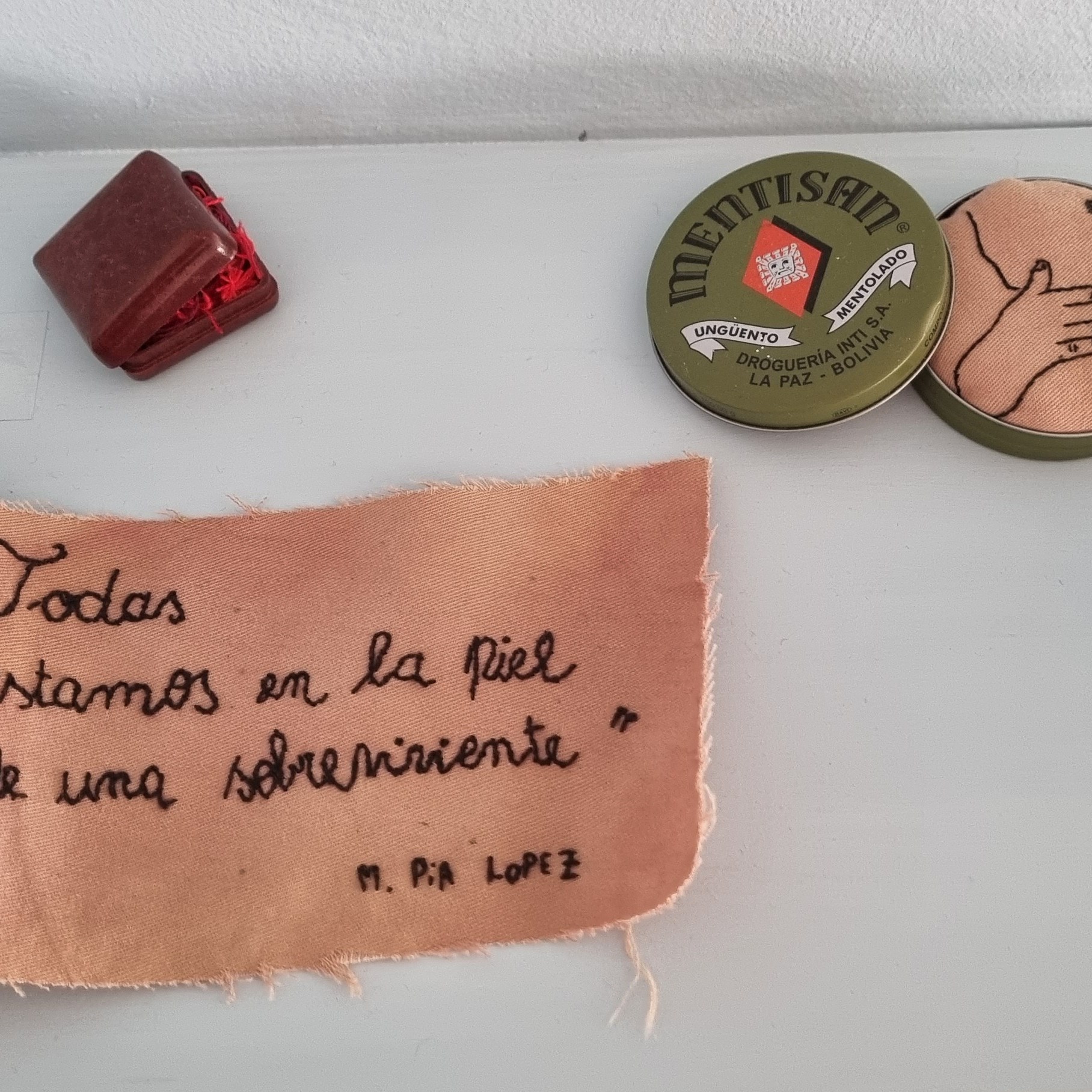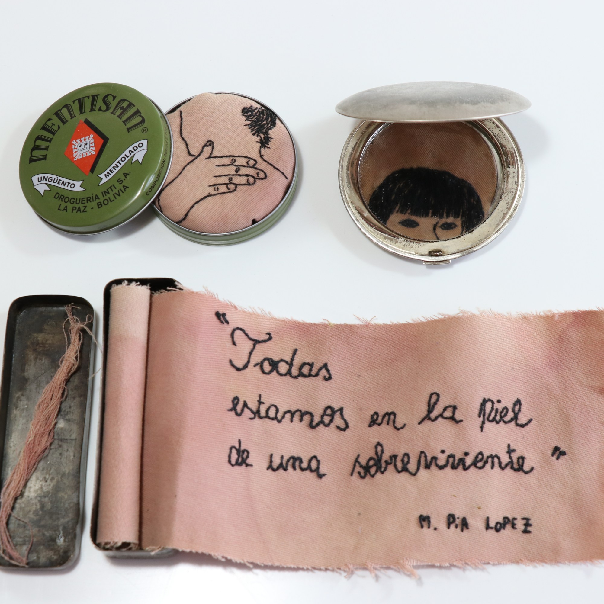 En la otra pared, minitextil de latitas sobre estante 20 x 30 cm