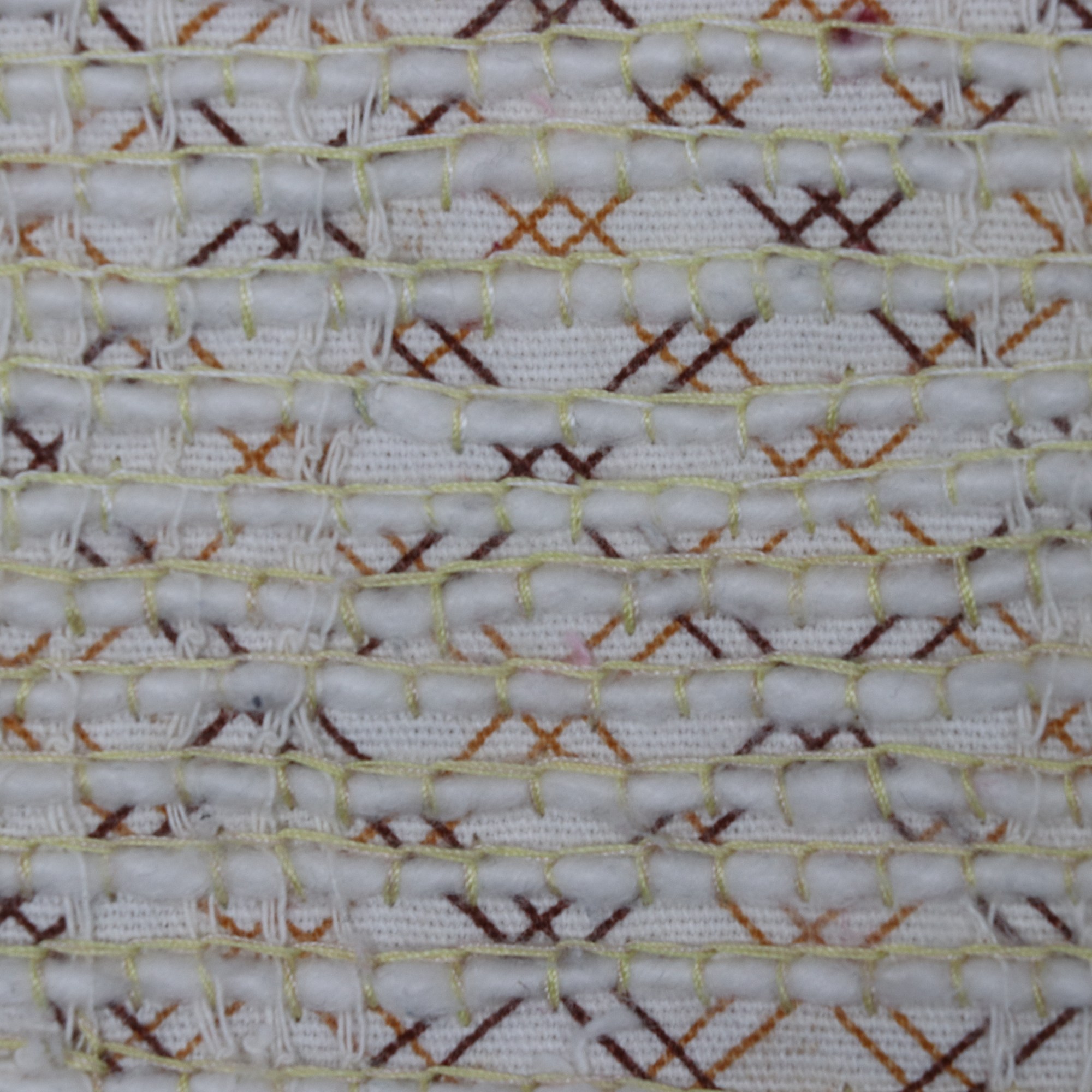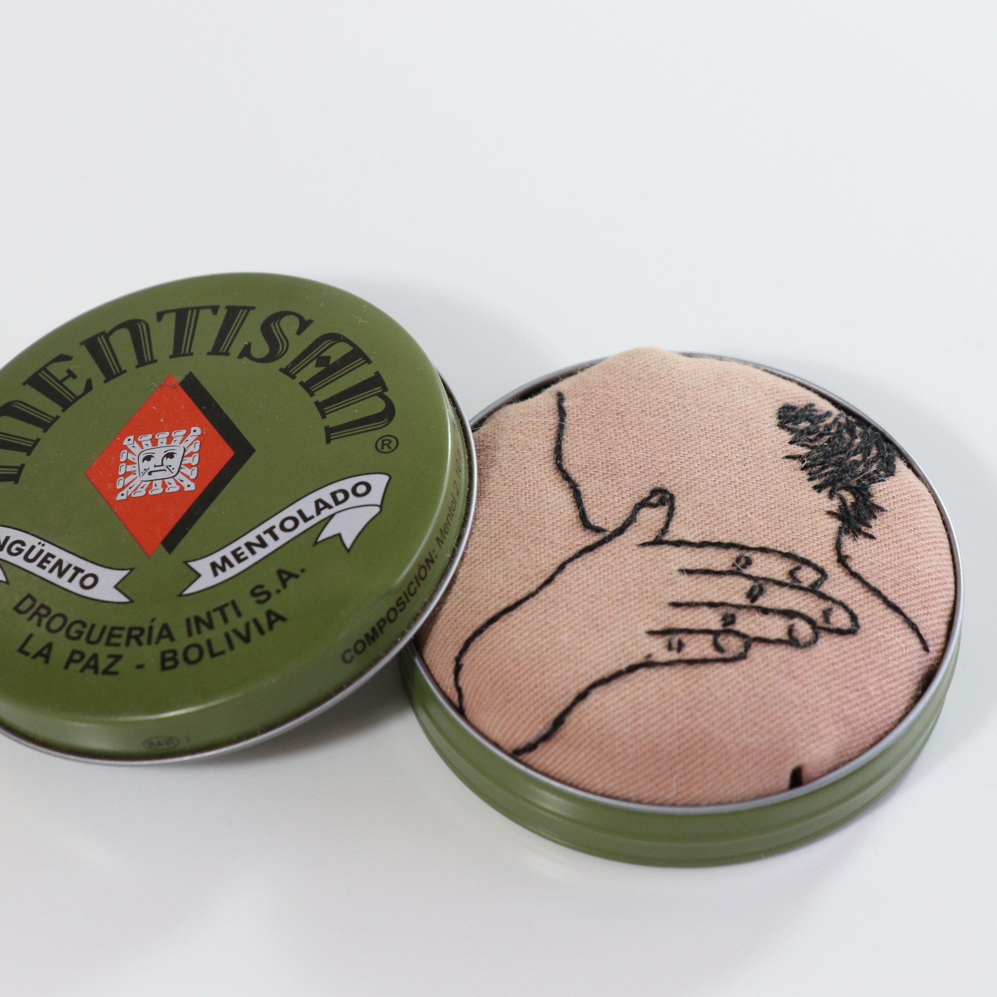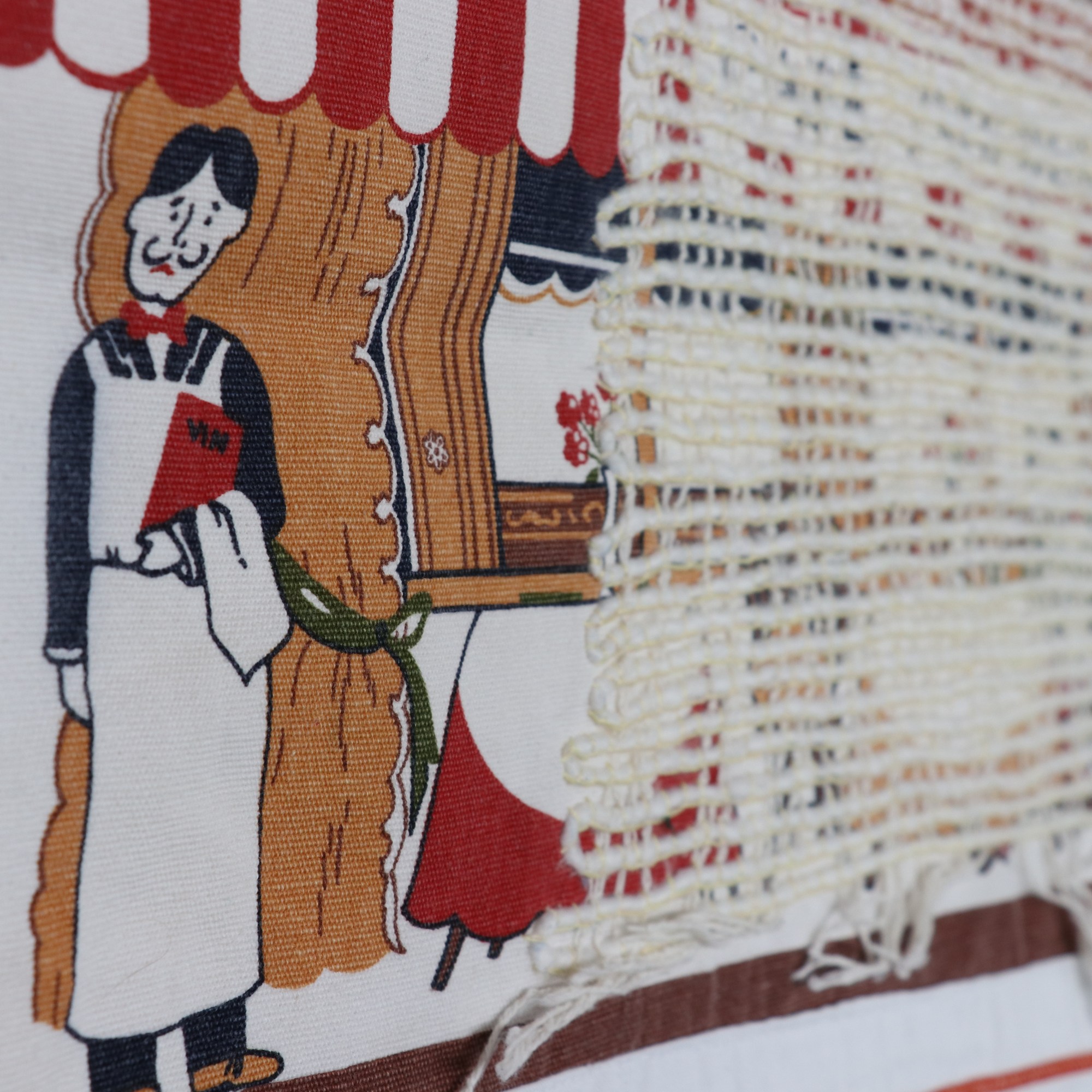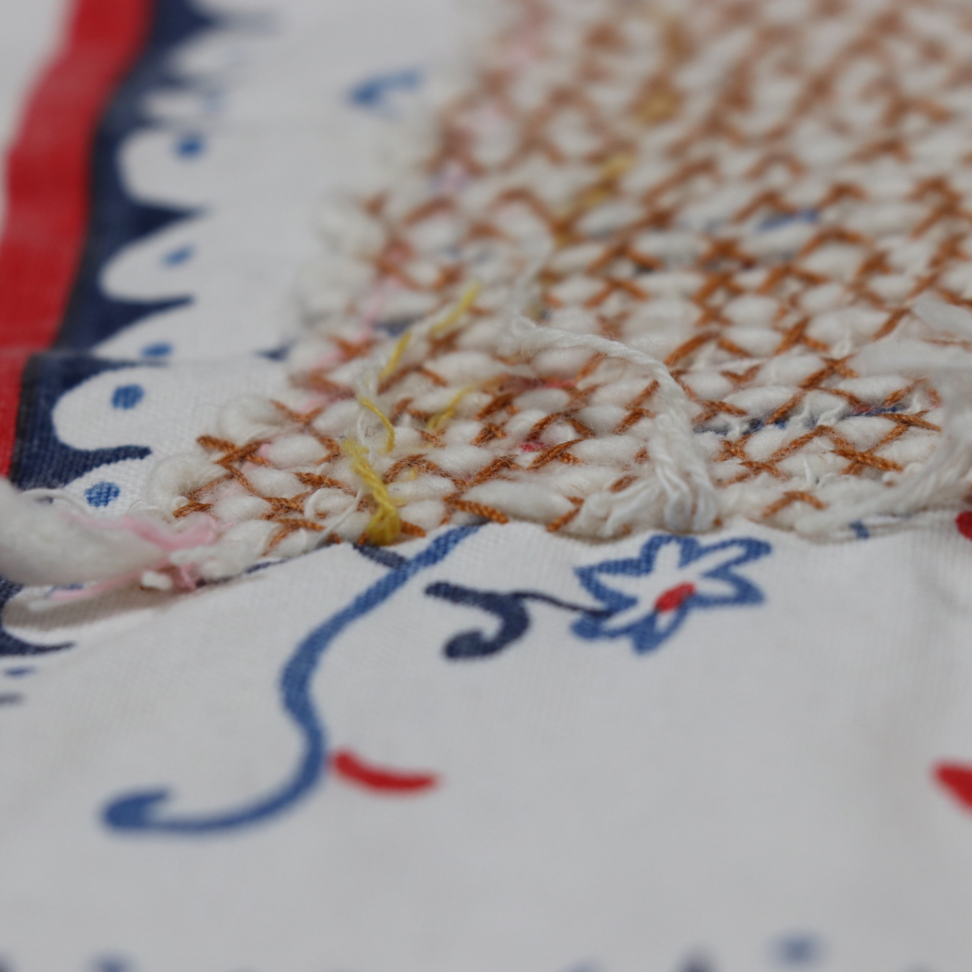 Técnica: rejillas de cocina aplicadas sobre repasadores antiguos con couching de hilos Tomasito. Bordado a mano. Latas antiguas con telas teñidas y bordados a mano.