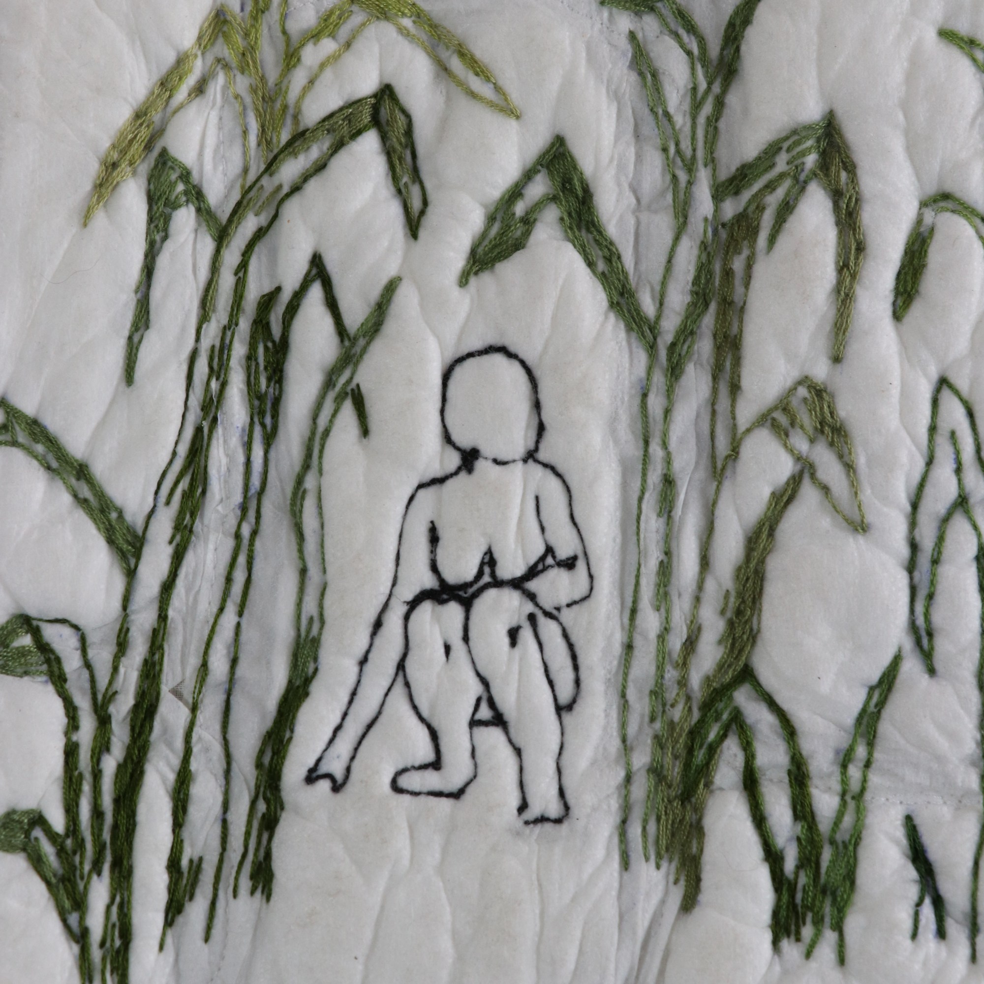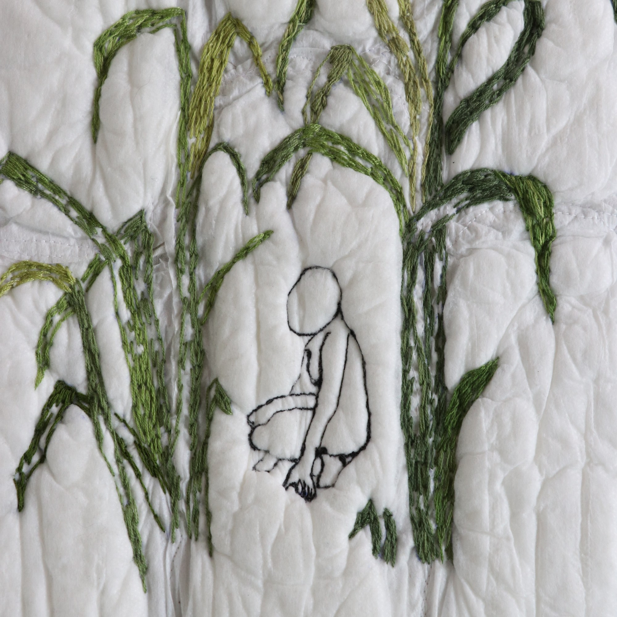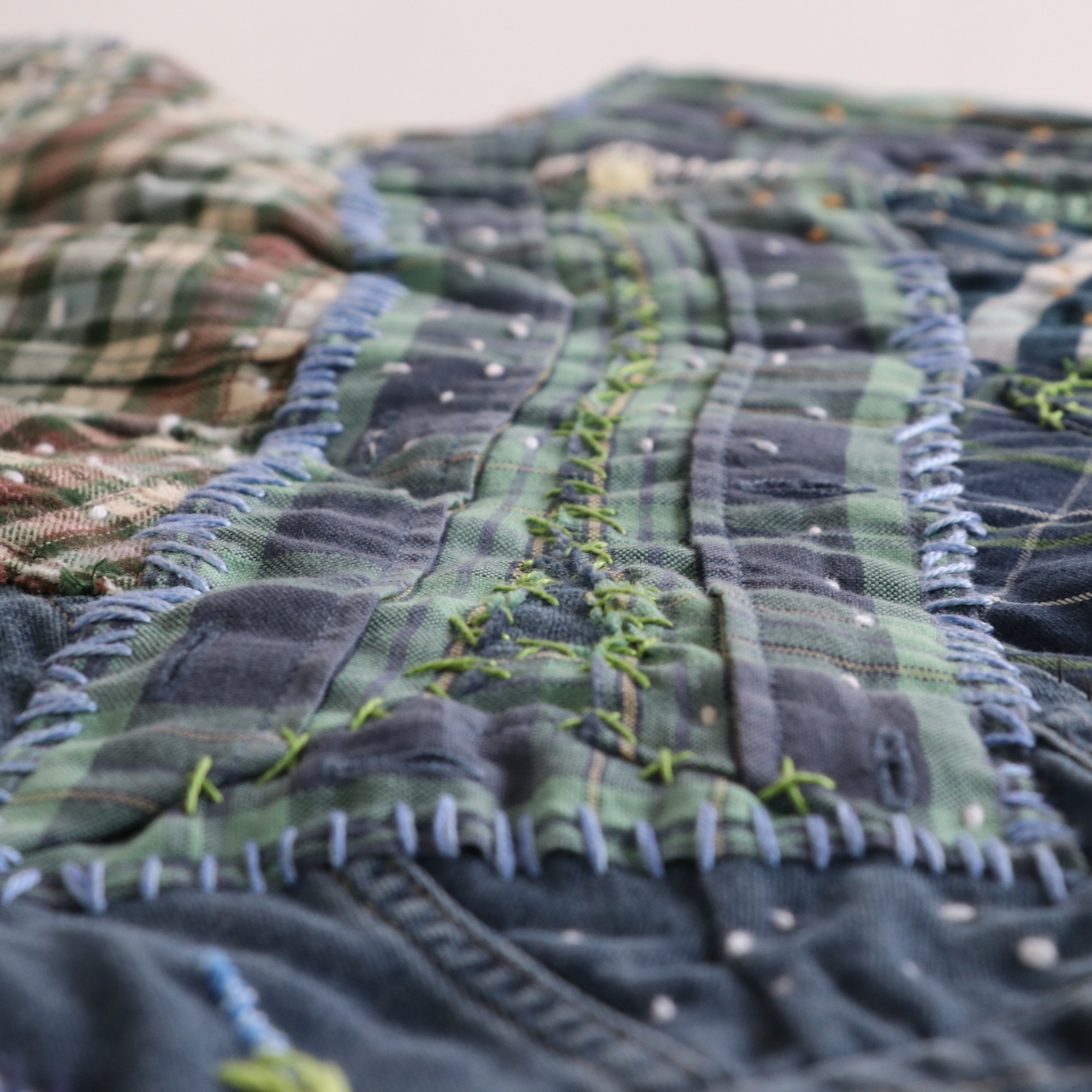 Técnica: Patchwork de camisas de hombre en desuso, toallitas femeninas unidas formando una pieza, ambos lados bordados a mano y unidos con máquina de coser y costura a mano