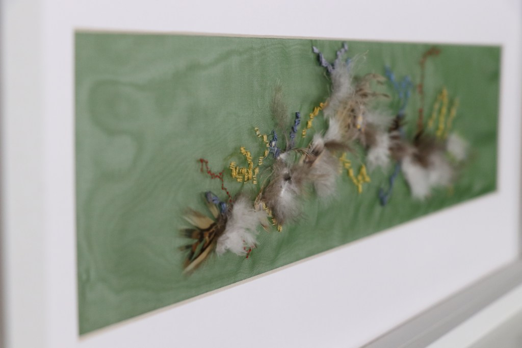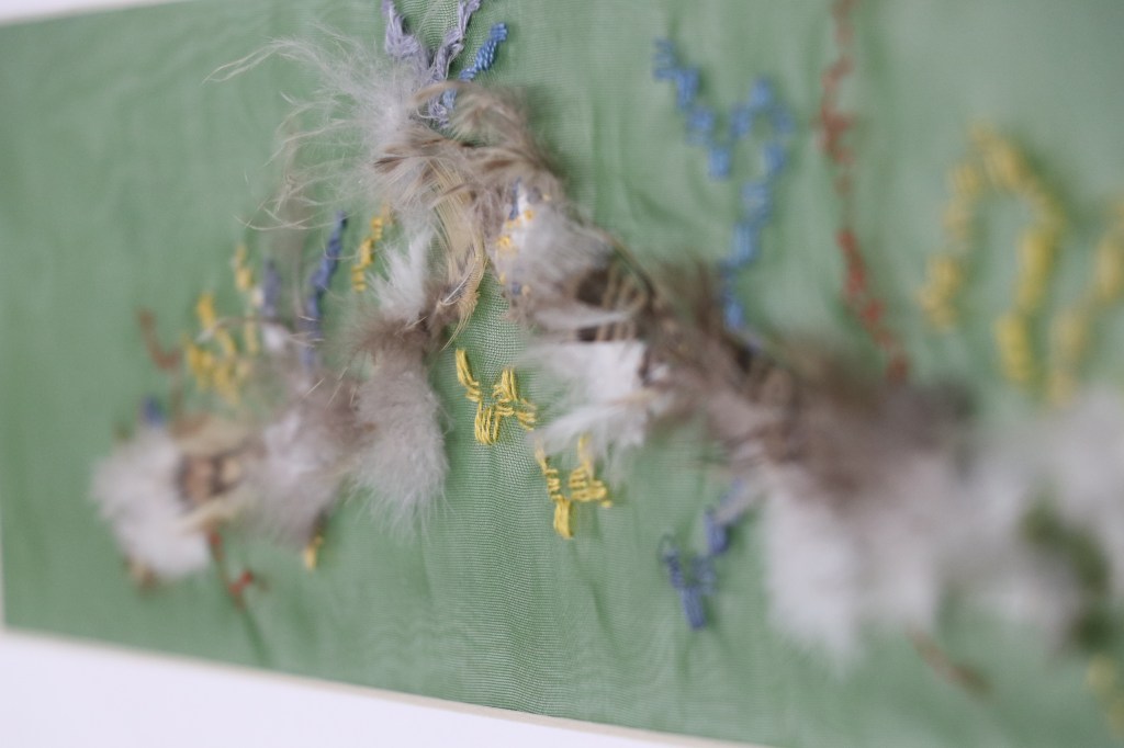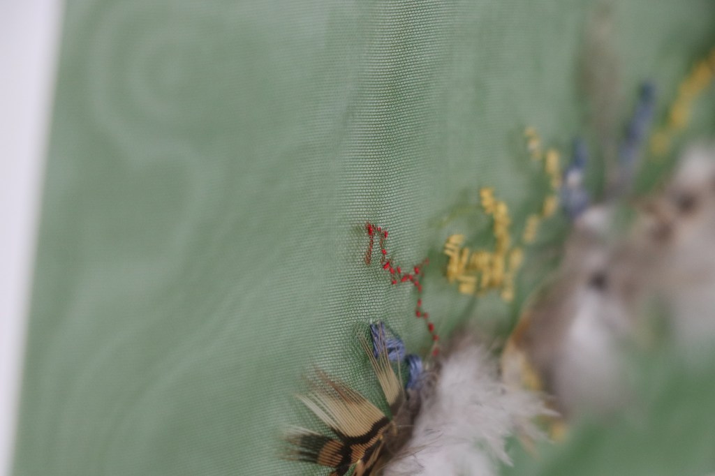 Técnica: bordado sobre plumas encontradas de cotorras y palomas, aplicados sobre gasa.